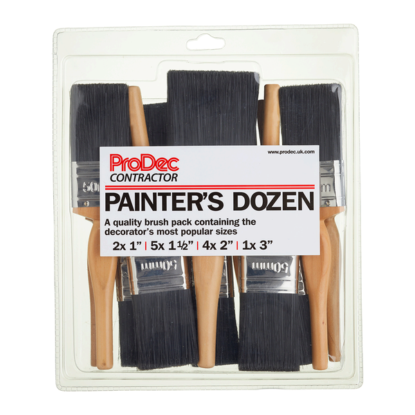 The Decorator's Dozen features the decorator's most popular sizes and is made with high quality synthetic filaments for excellent paint pick up and smooth release. Set contains 2x 1"(25mm), 5x 1.5" (38mm), 4x 2" (50mm) and 1x 3" (75mm) brushes.