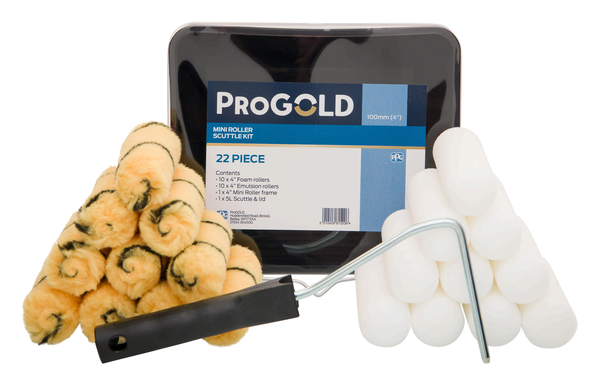ProGold Mini Roller Scuttle Kit. (Set contents: 10x 4" Foam Rollers, 10x 4'' Emulsion Rollers, 1x 4'' Mini Roller Frame, 1x 5L Scuttle & Lid)
