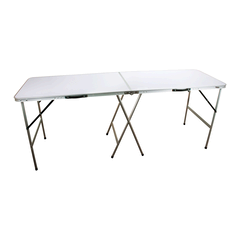 This table is lightweight yet sturdy, featuring a robust MDF board laminated with a waterproof melamine top. The straight leg design ensures it doesn't buck at one end when weight is put on it and the aluminium legs fold away quickly and effortlessly