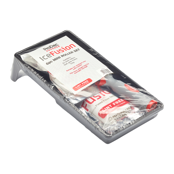 ProDec Ice Fusion 6-Piece Roller Kit includes 9" and 4" rollers, frames, and tray with advanced Ice Fusion fabric for exceptional paint loading, smooth release, and an ultra-smooth finish close to spray quality. Featuring Fused Fibre Technology for strength, lint-free performance, and consistent results, plus airtight storage bags, soft-grip handles, and a recycled plastic tray—ideal for emulsion on smooth and semi-smooth surfaces.